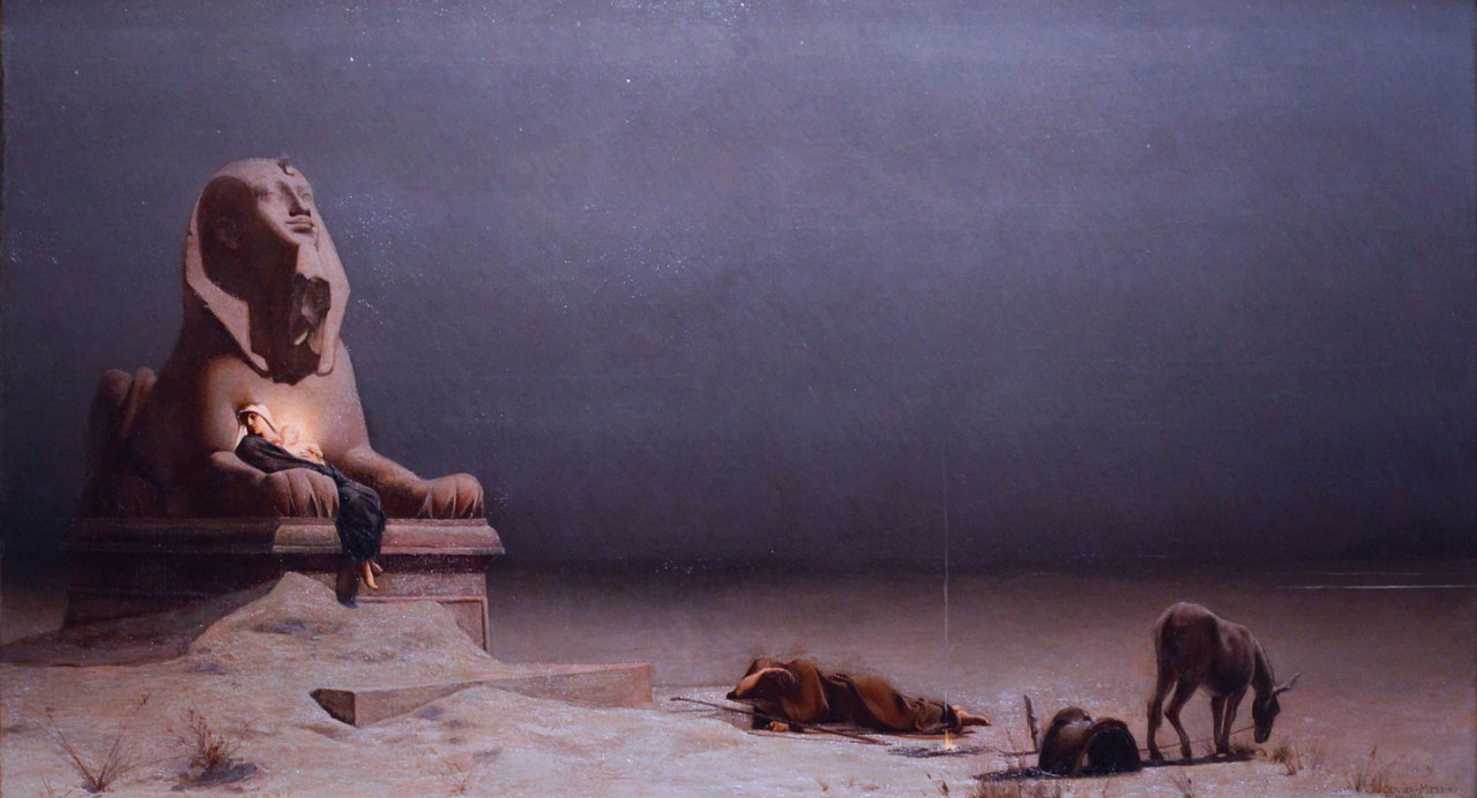 As fatigue and hunger overtook the Holy Family, they rested on their journey and settled for the night. Here we see Luc Olivier Merson’s rendition of the Rest on the Flight into Egypt, a popular subject in Christian art. In an austere desert scene, Joseph sleeps on the sand under a vast sky scattered with faint stars. At his feet, a thin ribbon of smoke rises from a weak, smouldering fire. Nearby, his donkey grazes on the few sparse shoots. On the left, Mary reclines with her baby between the arms of a sphinx statue dominating a third of the canvas. The child Jesus is covered with light, the brightest spot in the painting. The sphinx has its nose intact, and wears a pharaonic beard, unlike the Great Sphinx of Giza. Its head is tilted up toward the sky, and its expression looks peaceful and reassuring, in contrast to the barren landscape in the painting